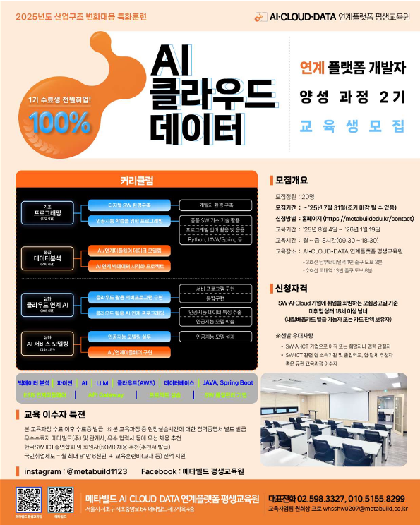 | [메타빌드] 평생교육원 - AI 클라우드 데이터 연계 플랫폼 개발자 양성과정 2기 교육생 모집 | |