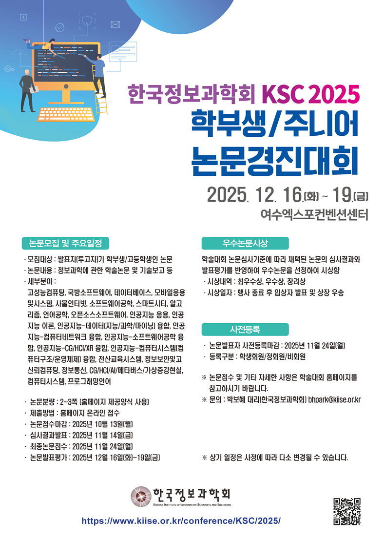 | (홍보) KSC2025 학부생/주니어 논문경진대회(12.16~19, 여수엑스포컨벤션센터) | |