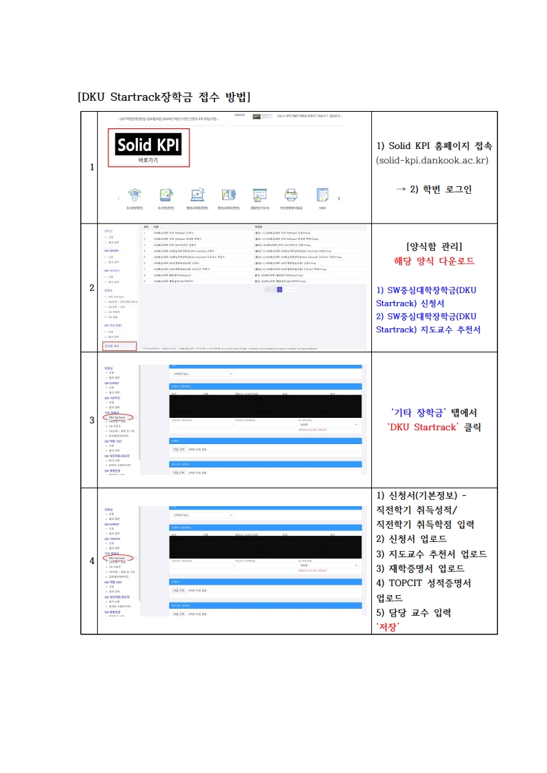 5. 신청 방법 : Solid KPI 홈페이지에서 신청(solid-kpi.dankook.ac.kr) → 신청 방법 아래에 상세 안내 (신청서 및 지도교수 추천서, 재학증명서, TOPCIT 성적증명서(선택) 제출)