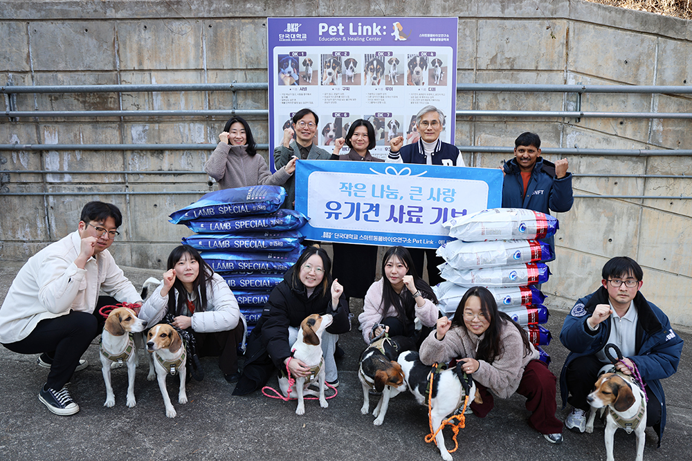 △ 박웅중 학장(왼쪽 두번째)과 김인호 소장(왼쪽 네번 째)이 윤혜원 대표(가운데)에게 사료를 기부했다. 바이오융합대학(학장 박웅준)과 스마트동물바이오연구소(소장 김인호)가 천안 지역 유기견 보호소 ‘애니멀스토리’에 사료를 기부하며 지역사회와 따뜻한 나눔을 실천했다. 스마트동물바이오연구소가 운영하는 ‘Pet Link’ 프로그램의 일환으로 진행된 세 번째 기부는 윤혜원 동문(공예전공 02학번)이 운영하는 천안 유기견 보호소와의 인연으로 성사됐다. 이번 기부는 대한사료(대표 박용순)와 천하제일사료(대표 권천년)가 사료 350kg(포대 20개)을 후원해 의미를 더했다. 윤혜원 대표는 “모교의 지속적인 관심과 지원에 감사드린다”며 “유기견들이 보다 건강하고 안정적인 환경에서 생활할 수 있는 기반이 마련되었다”고 전했다. 김인호 소장은 “반려동물에 대한 사회적 관심이 높아지는 가운데, 유기동물 문제는 우리 모두가 함께 고민해야 할 과제”라며 “앞으로도 연구소는 반려동물 복지 향상과 지역사회 공헌을 위한 실천적 활동을 계속 이어갈 것”이라고 밝혔다. [대학뉴스 제보] 죽전 홍보팀 : 031-8005-2032~5, 천안 홍보팀 : 041-550-1061